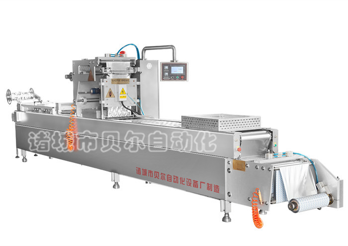 1、控制系統(tǒng)先進 該系列包裝機采用德國西門子觸摸屏、PLC及步進控制系統(tǒng),配用 原裝德國普旭真空泵。整機通過人機界面智能調(diào)節(jié)方便,步進精度 高,各動作協(xié)調(diào)一致,自動化程度高。 2、功能齊全 (1)可以在同一臺設備上選用彩膜或光膜覆膜形式; (2)可以根據(jù)用戶產(chǎn)品包裝要求配備自動打碼/噴碼系統(tǒng); (3)根據(jù)用戶產(chǎn)品包裝要求在抽真空的基礎上,可以充N2、02、 CO2 混合氣體或單一氣體,氣體混合比例可以通過氣調(diào)控制器方便 調(diào)節(jié); (4)設備配備斷相保護系統(tǒng),漏電保護系統(tǒng),相序保護系統(tǒng),避 免因停電,漏電以及人工操作失誤而造成的設備損壞,同時保障操 作人員人身安全; (5)設備配置上下模自動糾偏系統(tǒng),通過電腦自動感應覆膜與底 膜精準走向,及時調(diào)整覆膜材料在生產(chǎn)過程中出現(xiàn)的纏繞端面不平 問題,使產(chǎn)品包裝外觀更加完美,同時避免膜材浪費。 四、主要技術(shù)參數(shù)