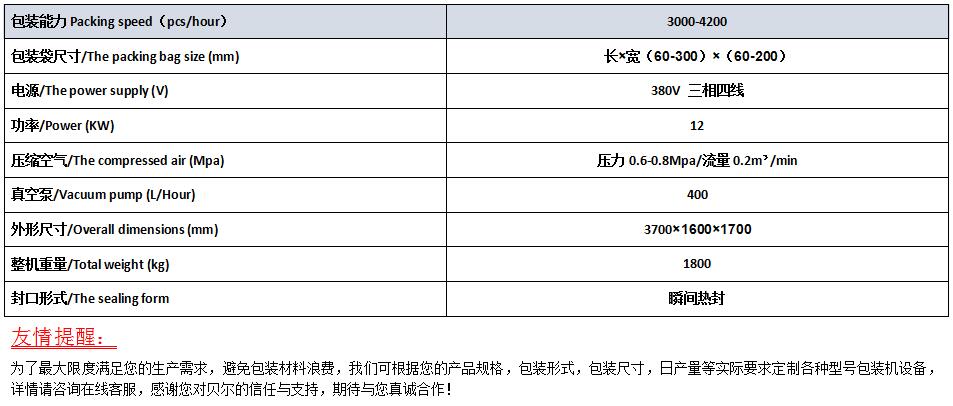 水平旋轉式全自動真空包裝機是我廠自主研發的新產品,中國第一臺水平旋轉式全自動真空包裝機于2004年誕生于我廠,已申請國家專利。該機與我廠給袋式包裝機及電子秤組合后能夠實現自動上袋,自動打碼,自動定量稱重上料、自動真空包裝,實現多功能全自動電腦操作。該機PLC控制系統、伺服控制器、伺服電機均采用日本原裝進口三菱、松下品牌產品。該機熱封部分使用電腦控制、水冷卻恒溫、封口電壓無級調節、封口質量及加熱條壽命。                                                                                                     (二)主要技術參數
